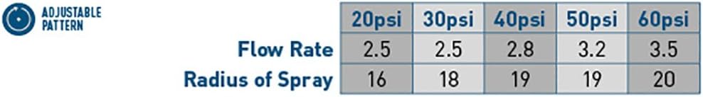 The spinning sprinkler has a 40-ft. diameter full-circle watering pattern that is ideal for garden and nursery applications. It provides up to 5,027 ft. of coverage and is constructed from durable, impact-resistant thermoplastic. The inlet threads are 1/2-in. female pipe thread (FPT). The most common method of installation is on top of a 1/2-in. male pipe thread (MPT) rigid PVC riser. For nursery applications you can suspend it upside down from an overhead drop hose. Recommended operating pressure is 40 PSI. For outdoor irrigation use with cold water only.