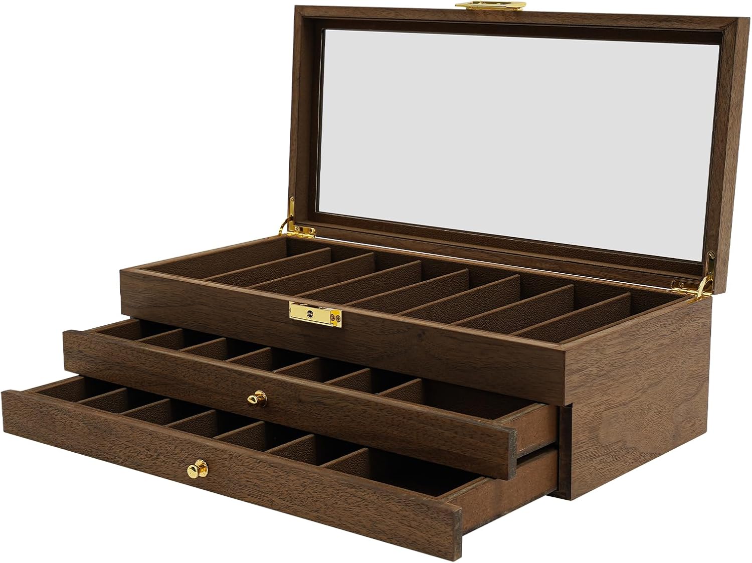 DescriptionAre you looking for a storage box that can safely store knives but also has a beautiful design? Our 3-tier knife storage box will be ideal for you. The excellent storage function, visual lid, and lock design make it not only a storage tool but also a pursuit of quality of life and respect for hobbies. ApplicationIt is suitable for storing a variety of knives, including cool knives, utility knives, pocket knives, camping knives, EDC knives, and other knives. It can be used to put forks, spoons, and so on.DetailsExquisite Handles: They allow for convenient and smooth opening and closing of the drawers, and easy access to your items. Metal Hinges: Reinforced hinges are more robust, durable, and reliable, effectively preventing loosening or detachment, thus extending the service life.Smooth Edges: The smooth edges enhance the beauty of the product and better care for your skin when using and cleaning it.Flannelette Lining: It protects the knives from scratches and provides complete protection for your collection.SpecificationsColor: Ebony ColorStyle: VintageShape: RectangularMaterial: Density Boards, Glass, Metal, FlanneletteAssembly Required: NoMounting Type: Tabletop Number of Tiers: 3Number of Compartments: 22Product Size: 40*19.2*12cm/15.7 *7.6 *4.7 inNet Weight: 3.32 kg/7.32 lbsPackage Included1* 3-tier Knife Storage Box1* KeyNotesPlease check the size carefully before ordering.Please note that only the top tier is lockable.