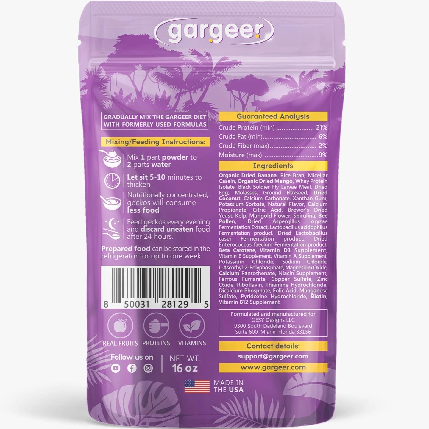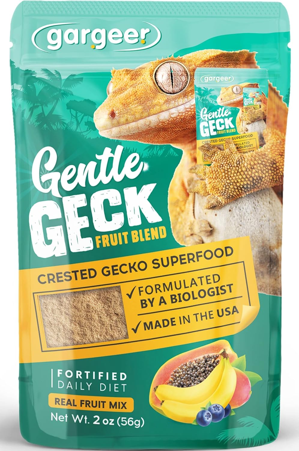 The best part of having a crested gecko is feeding them! For those wanting the best for their geckos, try GARGEER GENTLE GECK The Gentle Geck series uses premium ingredients, with no soy, wheat, or cheap fillers.GARGEER prides itself with an ‘animal first' approach. Our approach led us to collaborate with leading experts in the pet food industry who study not only the nutritional requirements of crested geckos but their feeding behavior as well. This led us to develop a complete diet that your cresties will enjoy.The GARGEER Insects Plus products (Breeder, Fig, Mulberry, and Tropical), use premium proteins from black soldier fly larvae along with nutrient-rich spirulina and marigold formulated to replicate the diet your cresties would consume in the wild. Even the pickiest crestie will love our Gentle Geck diet.The GARGEER FRUIT MIXES (Fruit Blend, Mango, and Papaya) are rich with premium proteins, antioxidants, vitamins, and minerals. GARGEER superfoods contain no unwarranted ingredients or fillers. The mixes are easily digestible, smell great, and contain no artificial flavors or colors.Our GARGEER blends were developed, formulated, tested and manufactured in the USA, WITH PRIDE.