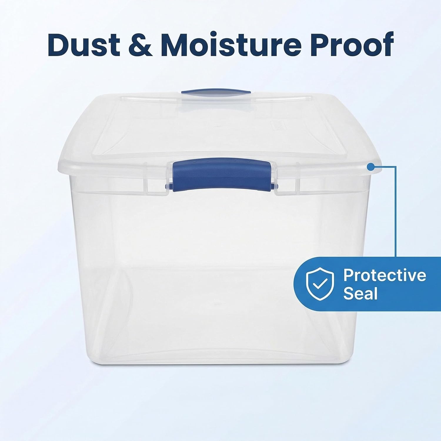 This 2-pack set includes 105-quart extra-large clear plastic storage bins with secure latching lids, designed to streamline your home organization. The transparent base and lid allow you to easily identify contents at a glance, while the sturdy latches keep belongings safely stored and provide a comfortable grip for carrying. Featuring a recessed lid design, these bins stack stably to maximize vertical space—ideal for clothing, blankets, bedding, camping gear, and more. Constructed from heavy-duty durable plastic, they are built for long-term daily use, making them a versatile storage solution for your closet, bedroom, garage, dorm, and all-around household needs.