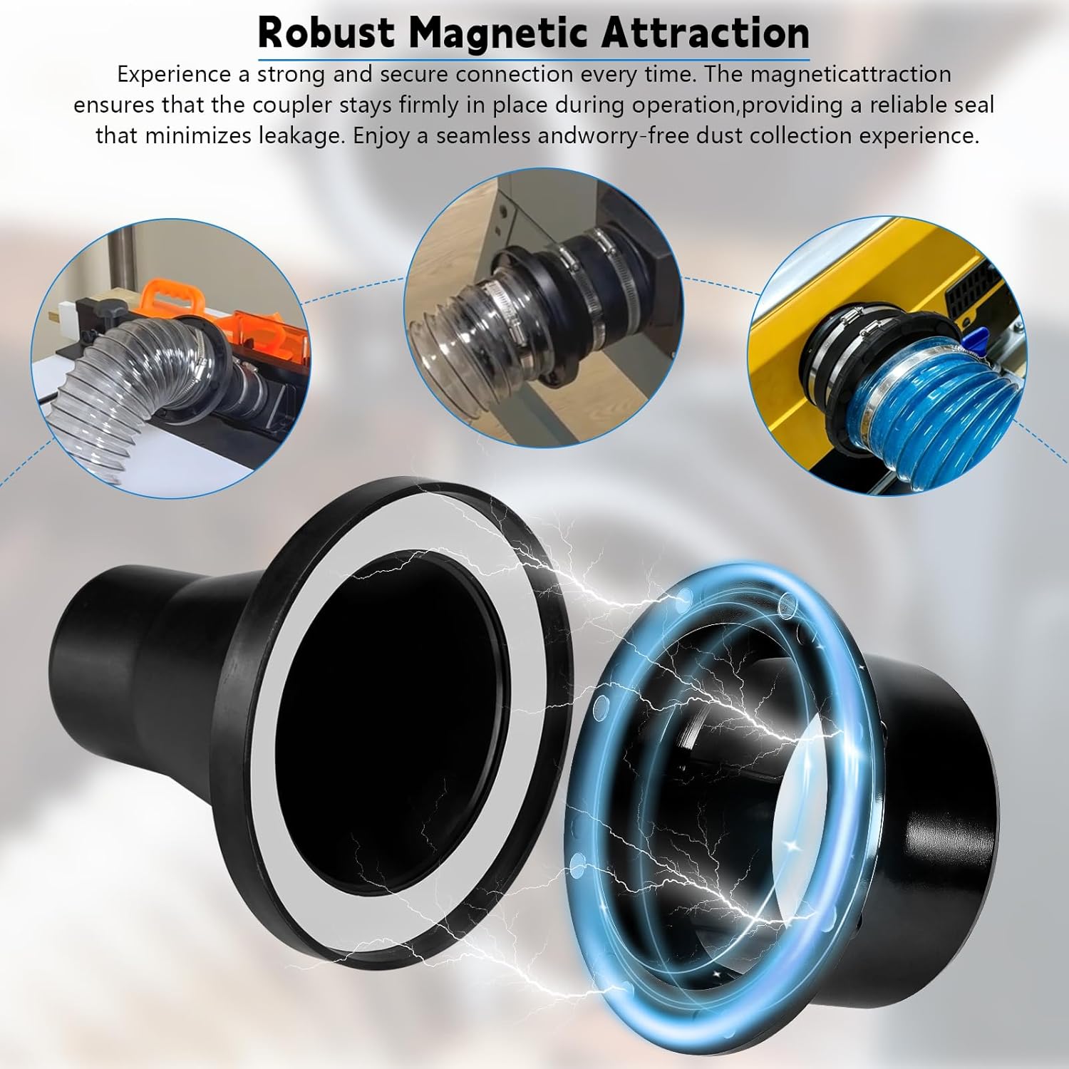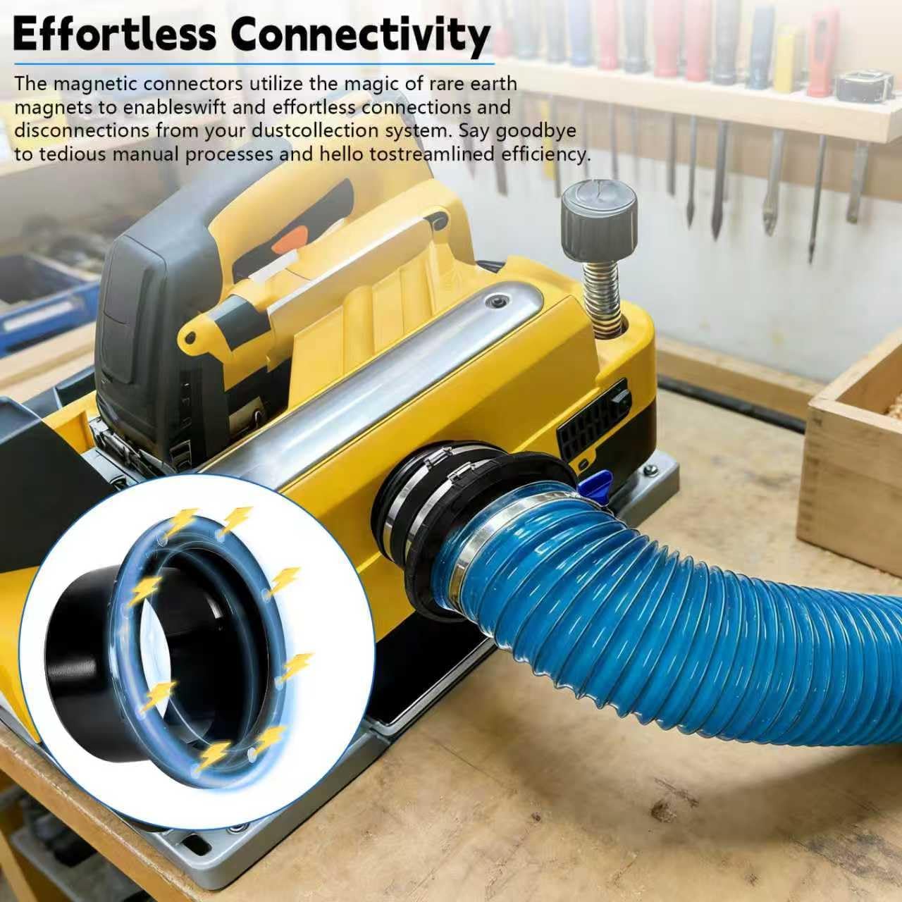 Transform your woodworking experience with our 4" Magnetic Dust Collection Kit, designed for quick and secure hose-to-tool connections. Featuring industrial-grade N52 neodymium magnets, this system provides a strong hold that withstands vibrations from heavy-duty machinery. Perfect for professionals and hobbyists alike, this kit simplifies your dust collection setup, making it easy to connect and switch between various machines, such as table saws, jointers, and planers.The leak-resistant sealing technology, featuring an interlocking groove and high-resiliency rubber gasket, minimizes air loss while maintaining optimal suction power. Constructed from durable, impact-resistant ABS material, this system is built to last through even the toughest woodworking tasks. Whether you’re working on large projects or making quick adjustments, the durable connectors ensure long-lasting performance and a cleaner, safer workshop environment.Compatible with standard 4" (and 2.5") dust collection hoses, this kit is designed to work seamlessly with most shop vacuums and dust extractors. Quick installation and secure fittings save you time, reduce downtime, and help maintain a cleaner workspace. With stainless steel hose clamps included, you can rest assured that the system will stay securely connected, even during heavy use.