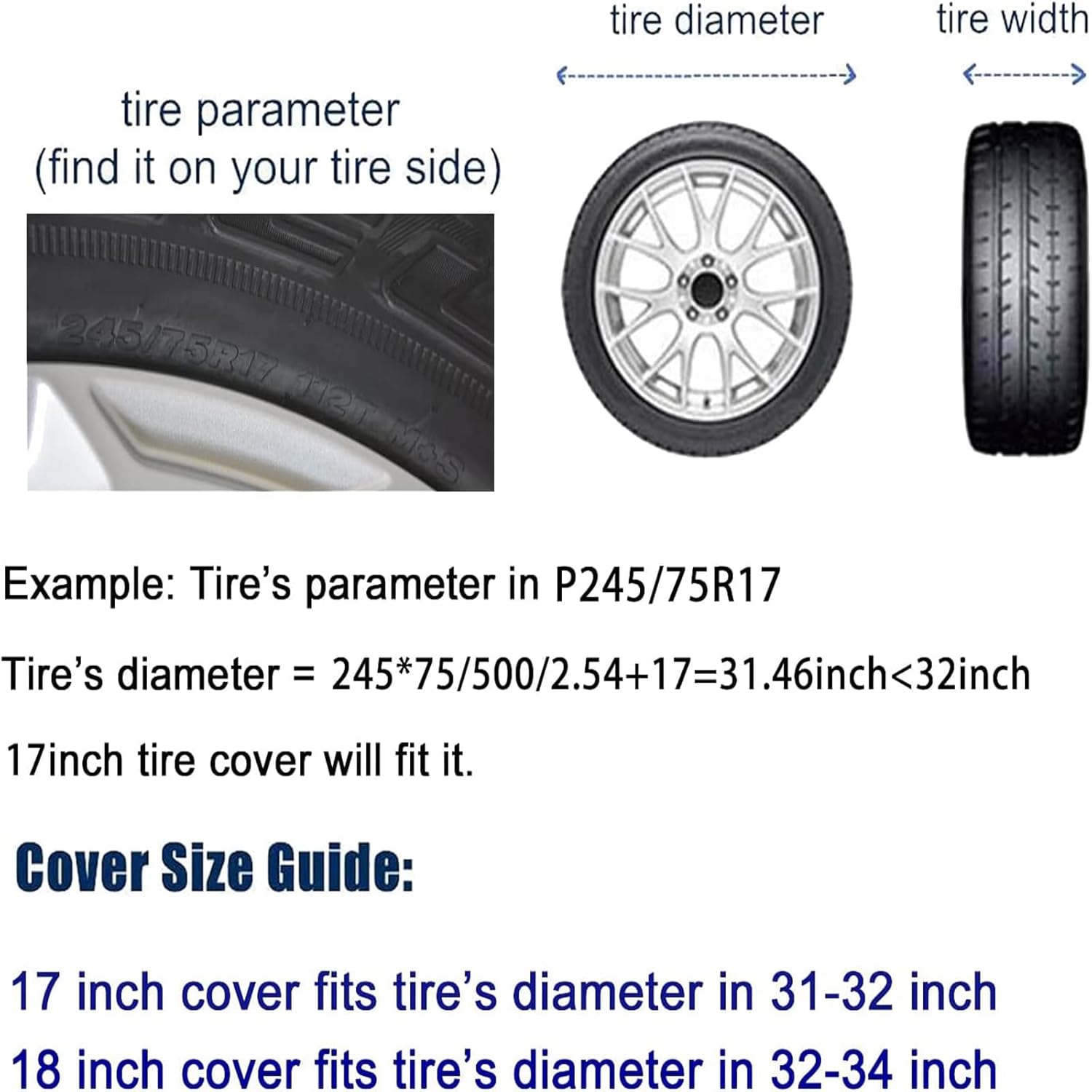 Spare Tire Cover Diameter Calculation GuideStep 1: Find Your Tire Parameter. It’s Written On Your Tire SideStep 2: Calculate Your Tire DiameterIf Your Tire Is Written With P225/65r17, A=225 B=65 C=17.Tire Diameter=A*B/500+C*2.54 =225*65/500+17*2.54 =72.43cmAccording To The Sizing Guide, You Can Choose The Right Size.