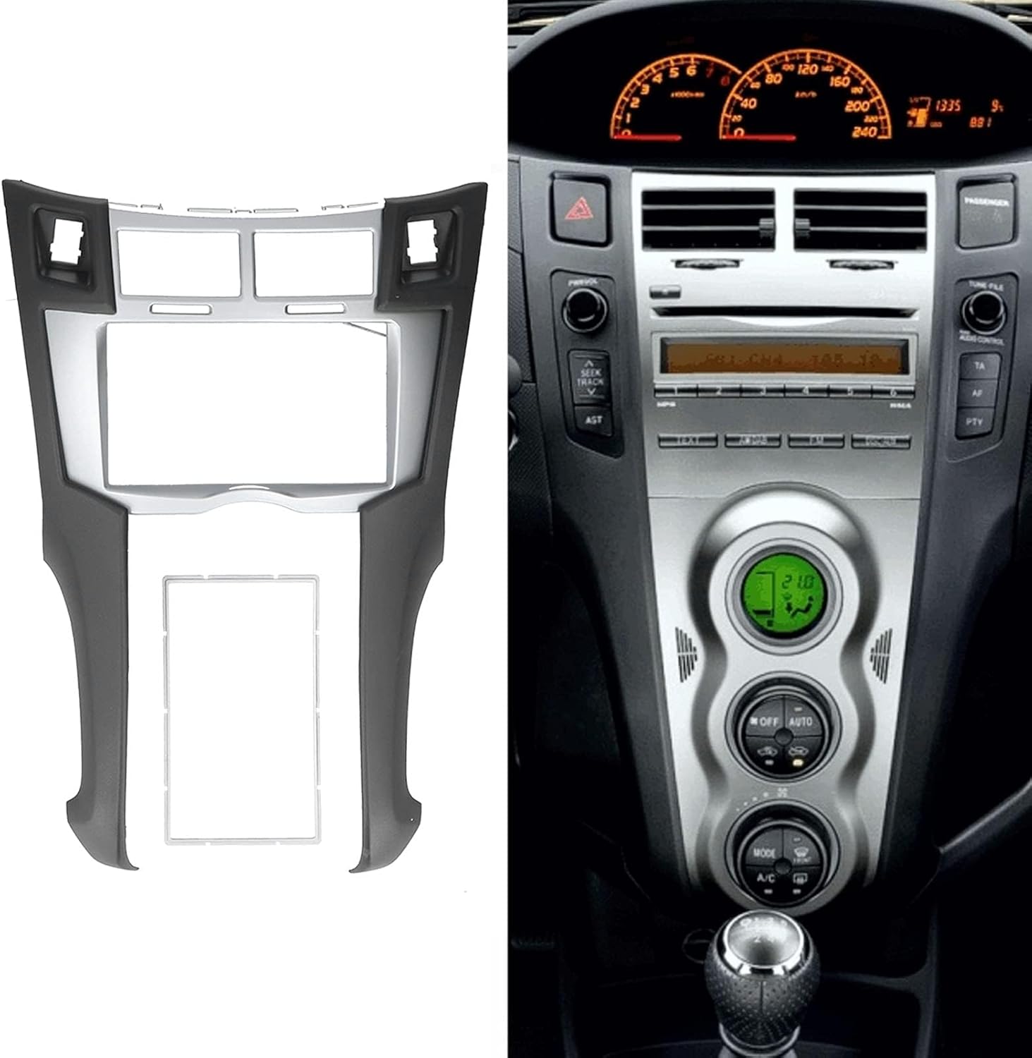 Specification: Item Type: Dash Kit Material: ABS Fitment: Fit for 2005-2011 Fit for Vitz 2005-2011 Fit for Platz 2005-2011 How to Use: Install on the original car 1. Disassemble the original panel 2. Use the new panel and fix it. Plug and play Main Frame Applicable Size: Approx. 178x102mm/7x4in Inner Frame Applicable Size: Approx. 173x98mm/6.8x3.9in Package List: 1 x Main Frame 1 x Inner Frame 2 x Bracket Note: Please allow for slight errors due to manual measurement.
