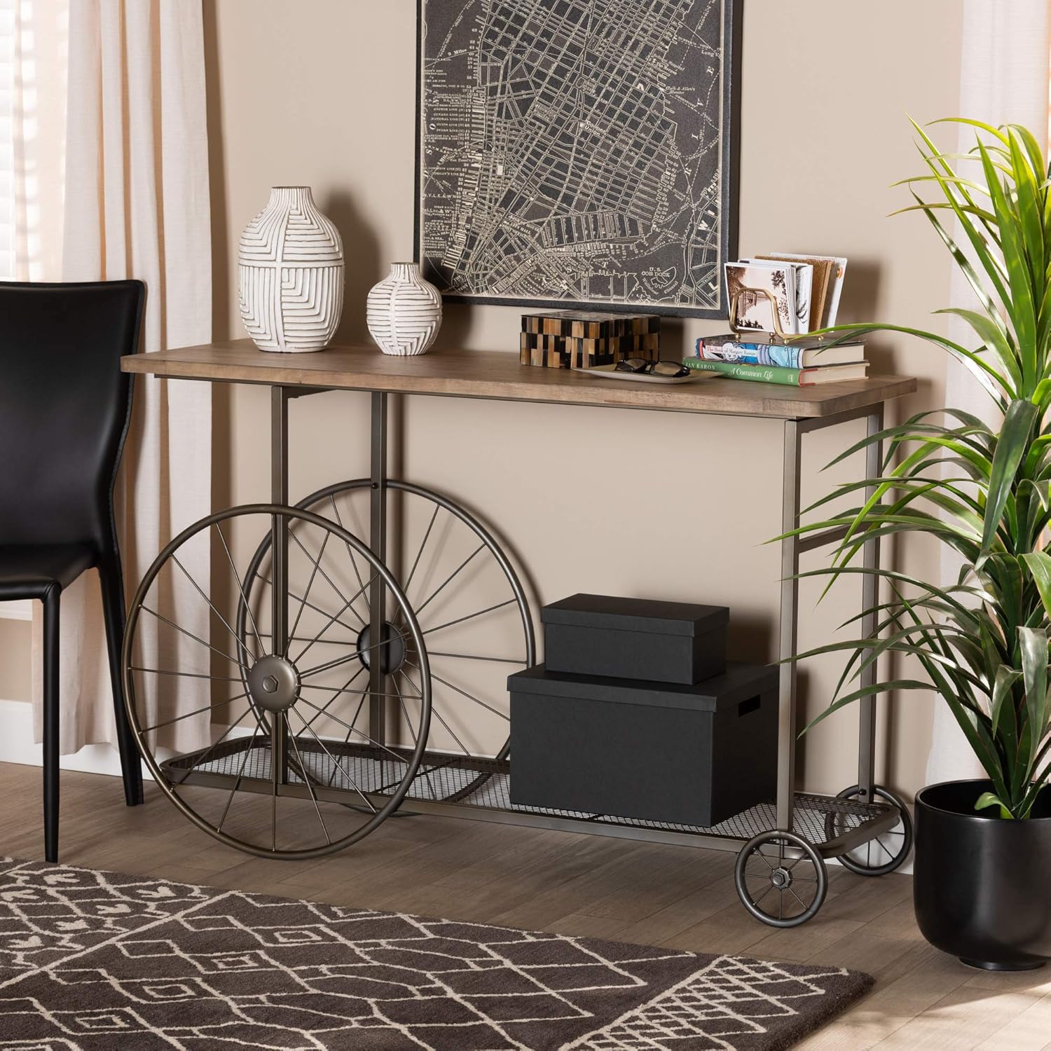 Add rustic charm to your space with the Terence console table. Made in China, the Terence is comprised of a black finished metal frame fitted with a natural finished wood tabletop. A lower mesh metal shelf keeps various items on hand while organizing clutter. Requiring assembly, the Terence is fitted with decorative wheels that lend a unique, eye-catching aesthetic. Bring some vintage charisma to your space with the Terence console table.