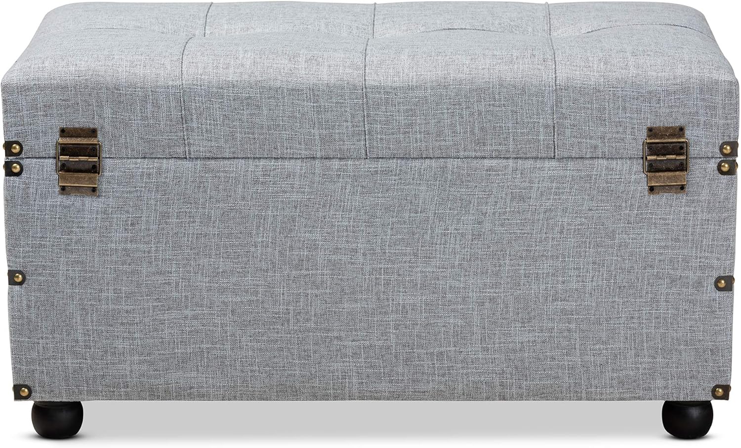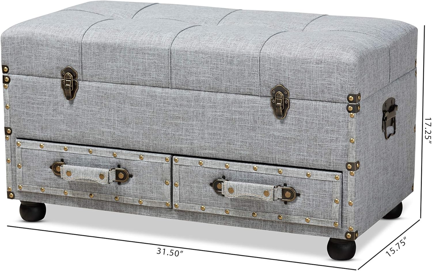 Stylish and versatile, the evangelina ottoman is an easy addition to any space. Set on top of black bun feet, the evangelina is upholstered in a chic grey linen-like fabric and features a cushioned lift-up lid that reveals extensive storage space. Two drawers located at the Bottom provide additional storage space. Inspired by vintage steamer Trunks, the evangelina is accented with antique brass latches and handles. Brass nailheads and button tufting add an extra dose of style. This versatile piece can be used as an ottoman, coffee table, or storage trunk. The evangelina ottoman is made in China and will arrive fully assembled. Dimensions: 17. 24" High x 31. 5" Wide x 15. 75" Deep; inner storage Dimensions: 30. 51" Wide x 14. 76" Deep x 6. 1" High; drawer Dimensions: 13. 39" Wide x 12. 6" Deep x 3. 94" High;