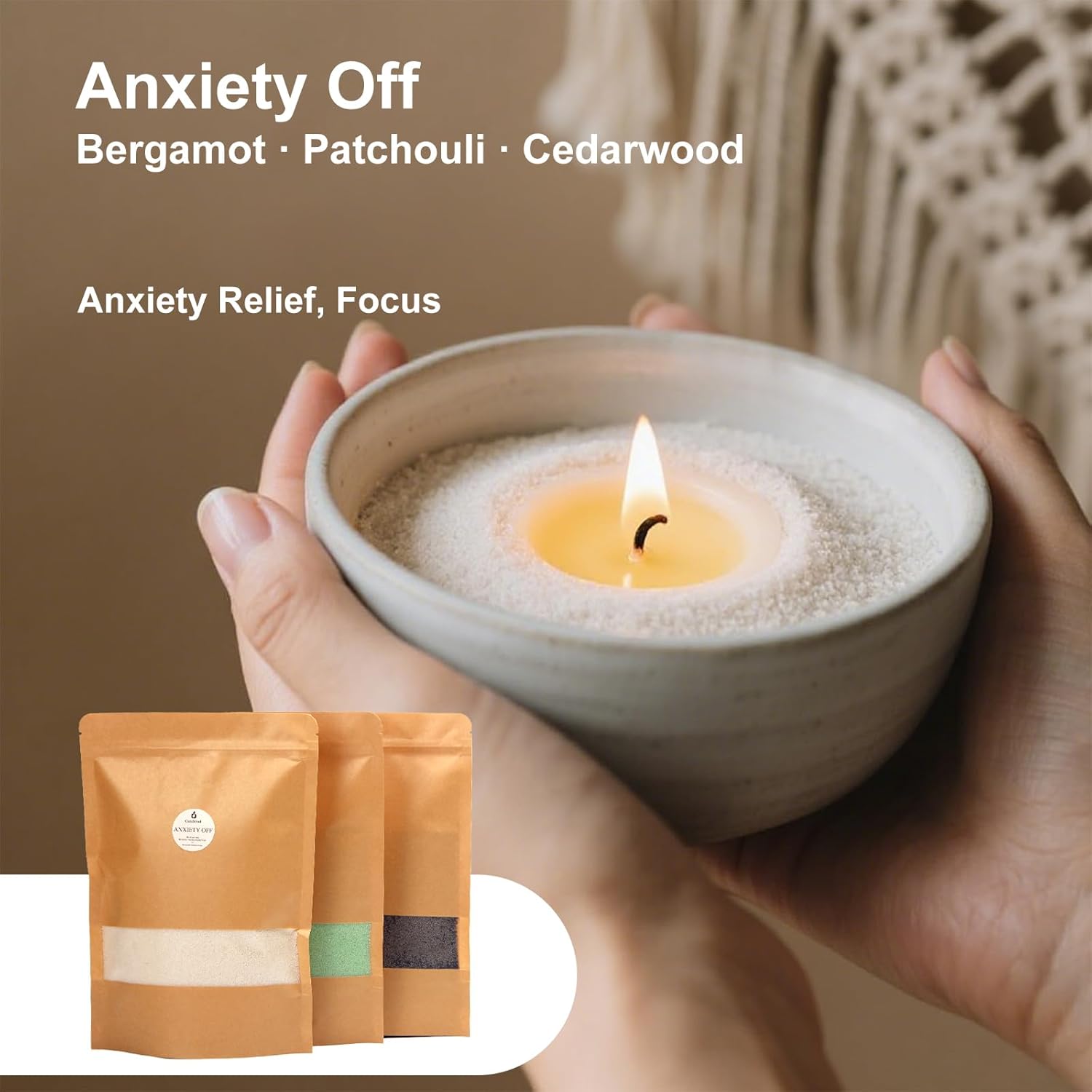 | Included Components | sand wax (1500g, light green, soy milk white, light gray), sand wicks, essential oils (bergamot, patchouli, cedarwood), instruction booklet |