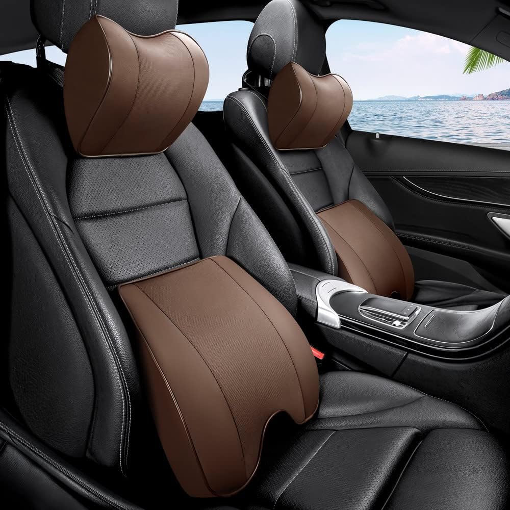 Matrial of the Cover:PU leather Filling: Memory Foam Size:Neck pillow size is:28*18*13cm Lumbar support cushion size is: 40*34*10cm Ergonomic neck pillow and lumbar support cushion make you feel comfortable when you sitting. Help you relieve back discomfort and maintain a healthy posture, Suitable for the people those who work or drive for a long time. All memory foam cores are temperature sensitive, in the cold winter, the foam core may harden, but due to body temperature, it will feel comfortable after 5 minutes of use. Reminder : It is recommended not to clean the memory foam core, and the leather can also be wiped with a damp cloth.