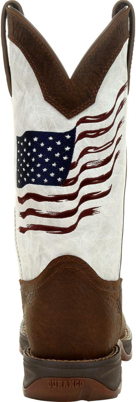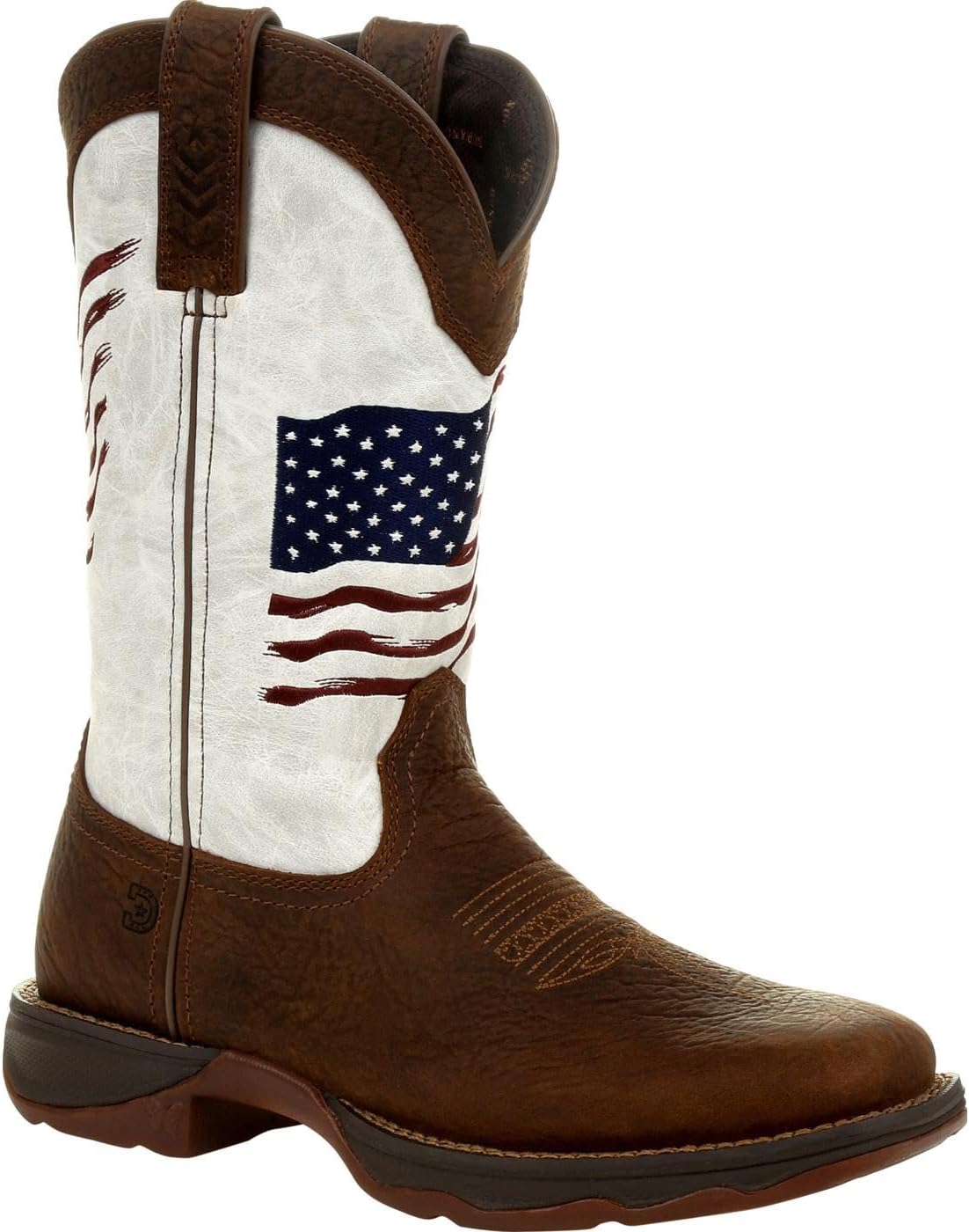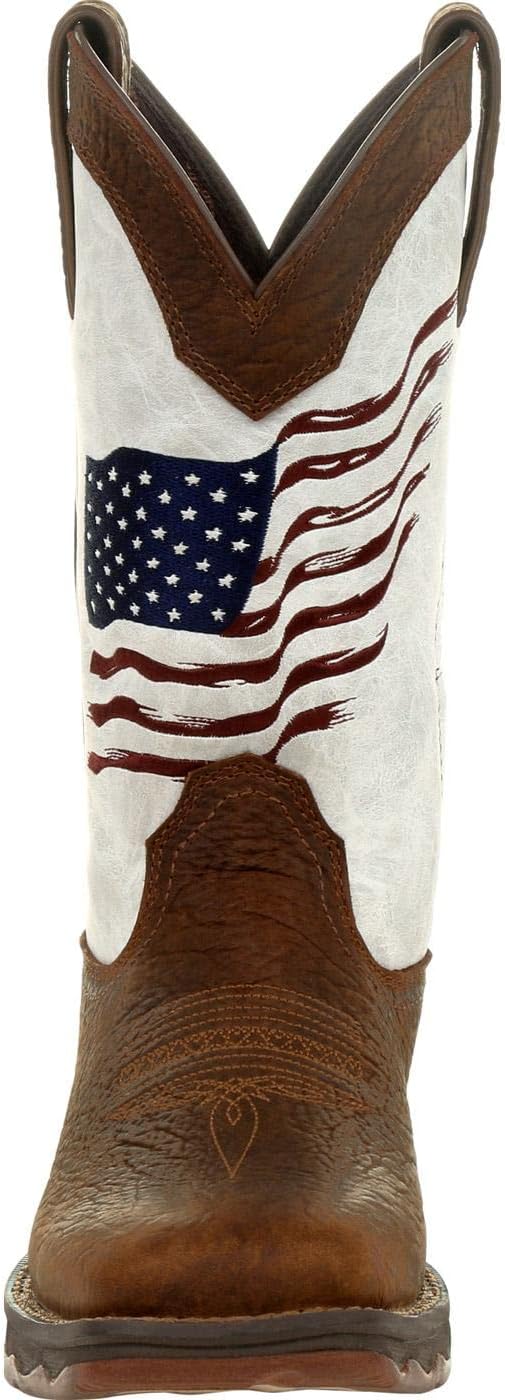 This is the women's Lady Rebel Distressed Flag Embroidered Western Boot by Durango. This 11-inch style in Western Bay Brown/White features a full-grain leather foot, collar and pull straps with a faux shaft. Inside it has a soft mesh lining, the Durango X-Pand System which is a hidden gore expansion for universal fit and easy on/off, the Durango X-Treme Comfort Footbed with memory foam for all day comfort and support, and a cushion flex insole. This style also features a fiberglass shank which provides lightweight stability and the rolled shank area allows easy placement in the stirrup. The Shaped EVA midsole is lightweight and flexible, and the outsole is dual-density and abrasion resistant translucent rubber. This style also features a double row sole stitch, 1 1/4-inch rocker heel and square toe. Pull on comfort in this women's patriotic style - get a pair today.
