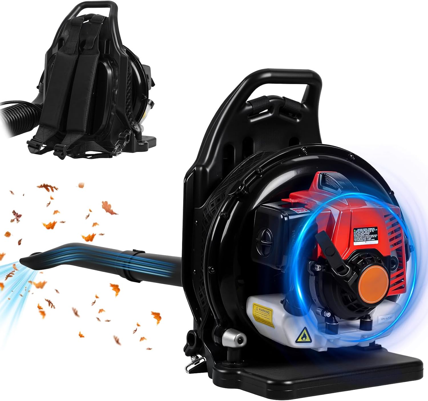 Product DescriptionKeep your outdoor spaces clean year-round with this 63cc Gas Backpack Leaf Blower. Featuring a powerful 2-stroke engine, it delivers up to 700 CFM airflow and 200 MPH wind speed, making it effective for removing leaves, snow, dust, and debris from your lawn, yard, garden, or driveway.Designed with an ergonomic backpack harness, adjustable handle, and low-vibration technology, this blower reduces fatigue, allowing for longer, more comfortable operation. The 1.3L fuel tank ensures extended working time, with recommended 30:1 oil mix ratio for optimal performance.With reliable air system, efficient fuel consumption, and durable build, this gas-powered backpack blower is a versatile tool for homeowners, landscapers, and outdoor maintenance professionals.Specifications:Engine: 63cc 2-stroke air-cooled single cylinderAir Volume: 700 CFMWind Speed: 200 MPHMaximum Power: 1.9KW / 7500rpmFuel Tank: 1.3L (92 octane gasoline + 2-stroke oil, 30:1)Noise Level: ≤110DBApplications: Lawn cleanup, yard maintenance, snow removal, outdoor debris clearingPackage Includes: 1 x Gasoline Leaf Blower, 1 x Toolkit, 1 x Funnel, 1 x Oil Pot, 1 x Instruction Manual