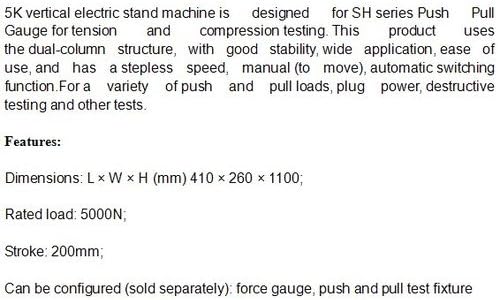 5K?vertical?electric?stand?machine?is designed for?SH?series?Push Pull Gauge?for?tension and compression?testing.?This product uses the?dual-column structure, with good stability,?wide application,?ease of use,?and has a?stepless speed, manual?(to move),?automatic?switching function.For?a variety of?push and pull?loads,?plug power,?destructive testing?and other?tests. Features: Dimensions: L ¡Á W ¡Á H (mm) 410 ¡Á 260 ¡Á 1100; Rated?load: 5000N; Stroke: 200mm; Can be configured?(sold separately):?force gauge,?push and pull?test?fixture