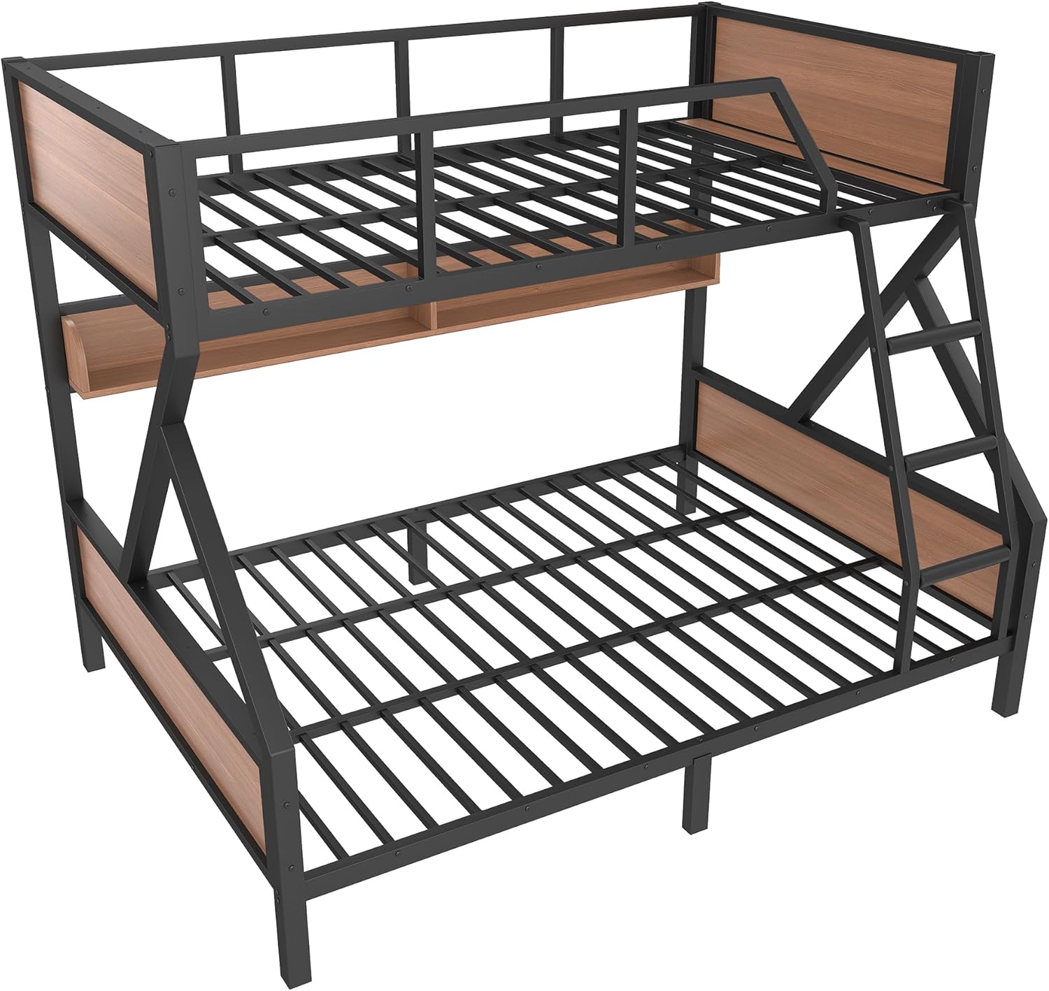 This bunk bed efficiently combines smart storage and modern convenience with its built-in upper and lower shelves, ideal for organizing daily essentials. It features a helpful LED light strip for nighttime use and ensures safety with full guardrails, an angled ladder, and enclosed headboards. Built from a heavy-duty metal frame with reinforced connections, it offers quiet, shake-free stability. Weight & Dimensions: Product Type: Metal Bunk Bed Color: Black Size Full or Full XL/Queen Material: Metal+MDF Overall Product Dimension: 83.46’’Lx62.99’’Wx62.40’’H Overall Product Weight: 145.28 LBS Weight Capacity: 500 LBS for Upper&Bottom Bed Recommend Mattress Thickness: 6'' for Upper Bed,8'' for Bottom Bed Number of Package: 2 Package Dimension & Weight Please refer to the Specification Level of Assembly: Full Assembly Needed Eligible for Hardware Packs: Yes Country of Origin: China Note : All the pictures are taken by actual samples, slight chromatic aberration may occur due to lighting or display.