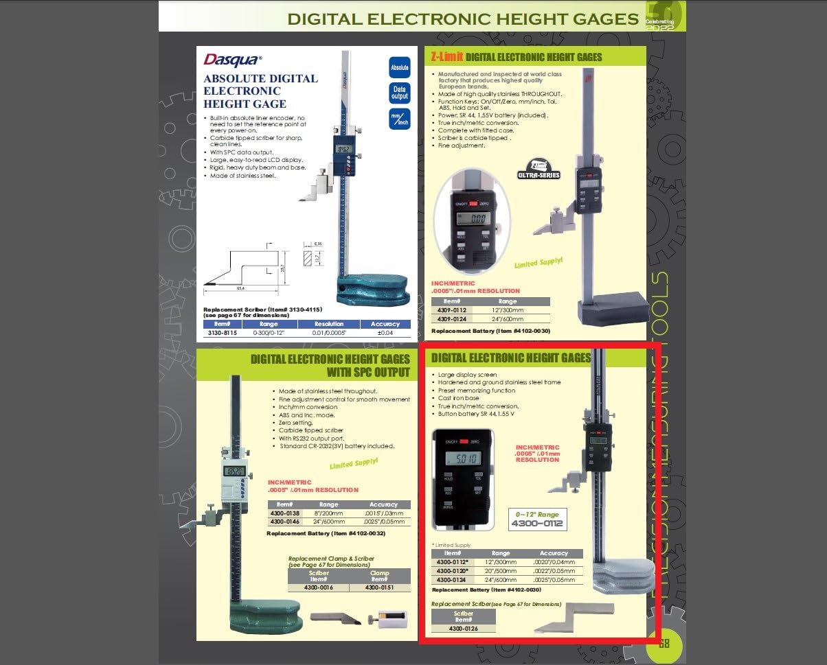 HHIP electronic height gage is garge display screen. Preset memorizing function. Hardened and ground stainless steel frame. Cast iron base. True inch/metric conversion. Resolution is 0.0005"/0.01mm. Size range is 0 to 24".