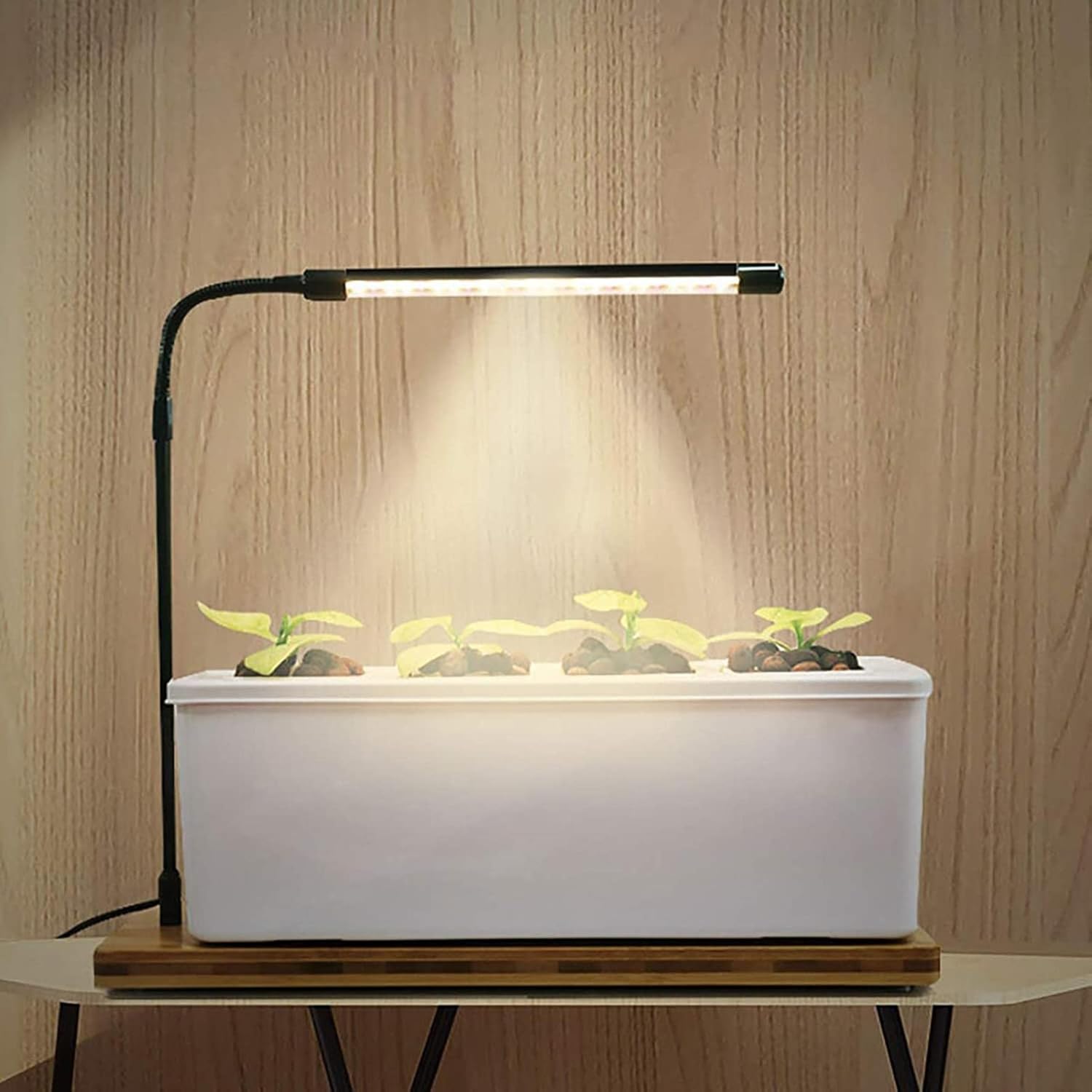 Features: LED light simulates natural sunlight, encouraging your plants and seedlings to grow. Easy assembly and lightweight materials mean you can set up anywhere. Smooth finish throughout for quick cleanup. -Simple and easy to use - -Creative and convenient -The hydroponic system is soil free, you can cultivate the vegetable you want at home without soil. -The growing speed of hydroponic plants are faster than that in the soil, and it saves land and water, labor and fertilizer. Specification: Material: ABS Product size: 40X14X13cm Product quality: 2.7kg Power: water pump 2W, lamp 6W Water capacity: 4L Number of plants: 4 Product features: scientific spectrum, visible water level, intelligent water pump, simple appearance Applicable places: dining tables, desks, windowsills, etc. Packing List: Planting pot x 1 Planting basket x 4 Water pump x 1 Water pump switch x 1 Bamboo plate lamp x 1