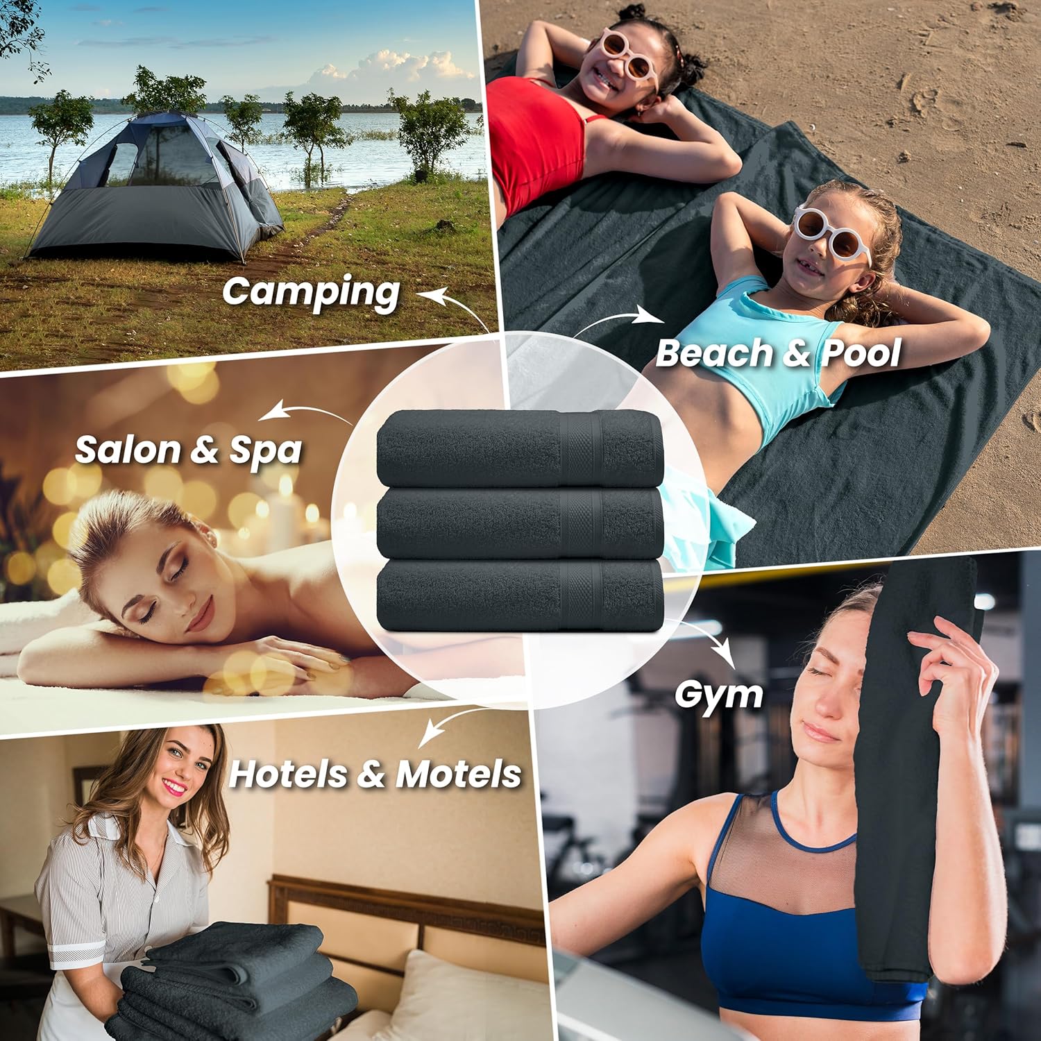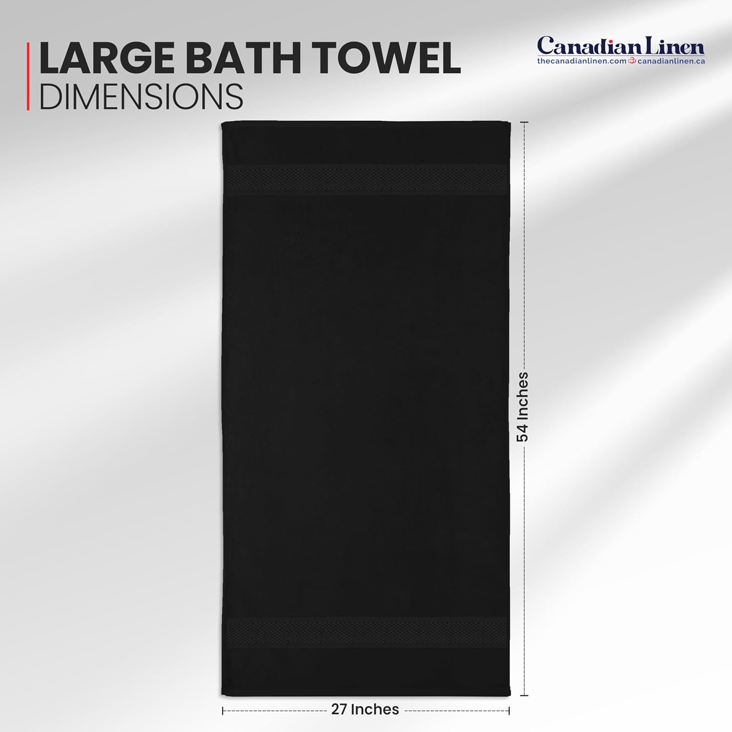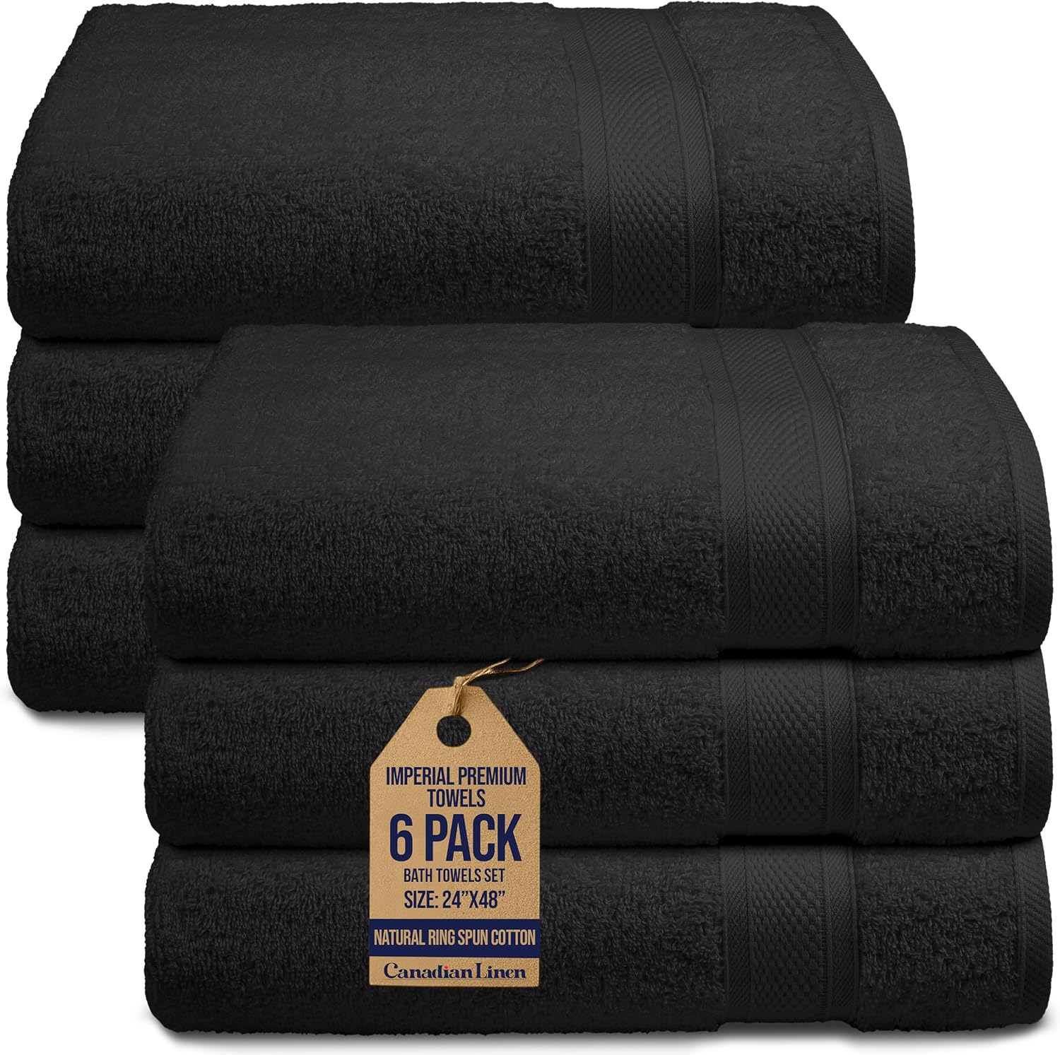 CANADIAN LINEN 4 PACK BLACK LARGE BATH TOWELS SET – IMPERIAL BRAND PREMIUM TOWELS: Canadian Linen Imperial Premium Black Color Large Size Bath Towels are 27 x 54 inches in size and come in a value pack of 4 bath towels. BEAUTIFUL & ATTRACTIVE COLOR TOWELS: Imperial brand Towels are available in 8 beautiful and attractive colors: Navy Blue / Dark Blue, Capri Blue / Light Blue, Charcoal Grey / Dark Grey, Hunter Green / Deep Green, Moss Green / Olive Green, Espresso Brown / Dark Brown, Jet Black, and Pearl White colors. SOFT, SMOOTH & ABSORBENT BATHROOM TOWELS: Imperial Towels are made of 100% premium ring spun cotton. Their soft & smooth Terry Texture is highly absorbent, gentle on skin and provides a great feel of luxury & comfort. They are hypoallergenic & fade resistant. BRICK BORDER DESIGN – DECORATIVE SPA TOWELS: Imperial towels feature a stylish Brick Border Design that adds a luxury look to your home décor with matching bath towels, bath sheets, hand towels, washcloths / face towels, towel sets, and piano border design bathmats. LIGHTWEIGHT QUICKDRY DURABLE SALON TOWELS: Our fast dry light weight towels are double stitched on all sides for durability ideal for hotels, motels, hospitality, Airbnb, vacation rentals, hair salon, sauna, guestroom, massage parlor, restaurant, nursing home, barber shop, office, senior care, hospital, college, dorm, shelter, and retirement center. SUSTAINABLE REUSABLE ECO-FRIENDLY TOWEL SET: Our Cotton Towels are sustainable and eco friendly alternative to plastic / polyester, microfiber towels / cloths, disposable napkins, facial tissue, and paper towels. They are reusable, machine washable, and a natural & organic healthy choice. MULTIPURPOSE TERRY COTTON TOWELS: Our body towels are used as hair towels, salon towels, body towels, hotel towels, daily towels, pool towels, shower towels, wrap towels, nursing towels, spa towels, barber shop towels, sports towels, dish towels, fingertip towels, gym towels, yoga towels, couple towels, travel towels, kitchen towels, cleaning towels, auto towels, beach towels, guestroom towels. BRANDED QUALITY FOR AFFORDABLE PRICE: Canadian Linen is one stop shop for all bed & bath linen. We offer towels, bathrobes, bedding, duvet, comforters, blankets, pillows, protectors, mattress pads, bamboo encasements, laundry bags, curtains, etc.