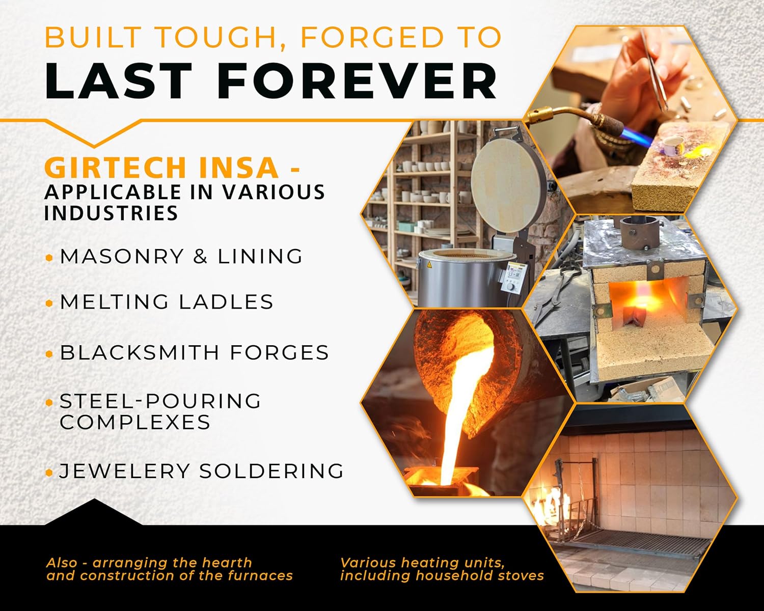 Lightweight insulating brick GIRtech INSA Lightweight brick which are used for lining heating units as an effective insulating or warming layer. GIRtech INSA ā is a special lightweight insulation brick which are used for lining heating units with a maximum temperature of use up to 2370 ° F, as an effective insulating or warming layer. Firebrick can be used in any type of domestic heating units, such as brick fireplaces, steel furnaces, heating stoves, barbecues and barbecue complexes as insulation. It is made from eco-friendly natural components and safe for human health This product could be used in industrial units as insulation and warming layer without contact with molten metals. Refractory masonry must be done on a fireclay/alumina mortar, for example GIRtech CONTACT-40 or GIRtech CONTACT Drymix. Before performing work, it is necessary to moisten the contact surface with some water. It is not recommended to use cement mixes as a masonry mortar. GIRtech INSA could be cuted or processed with a special tool if necessary Firebricks are packed in branded cardboard boxes of 4 pieces