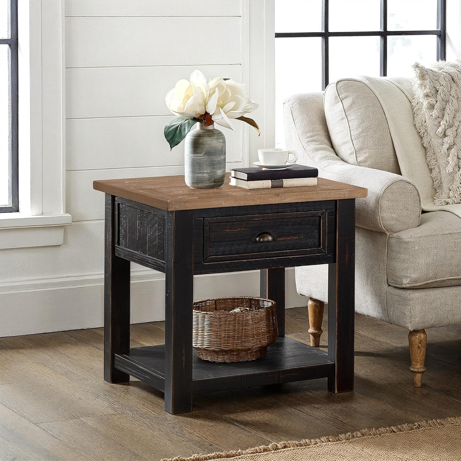 Bring timeless style and everyday function to your home with this solid wood coastal farmhouse end table. Crafted from pine wood, it’s built to last and designed with charming details like framed drawer fronts, antique pewter hardware, and miter-cut edges that elevate any space. Use it as a living room side table next to your sofa, a rustic nightstand beside your bed, or a stylish accent table in your home office. A smooth ball-bearing drawer keeps remotes and reading materials tucked away, while the lower shelf is perfect for décor, baskets, or books. With its versatile size, durable build, and classic coastal farmhouse furniture appeal, this table is as functional as it is beautiful—making it an easy upgrade for any room. Table Dimensions: 24" L x 24" D x 24"H
