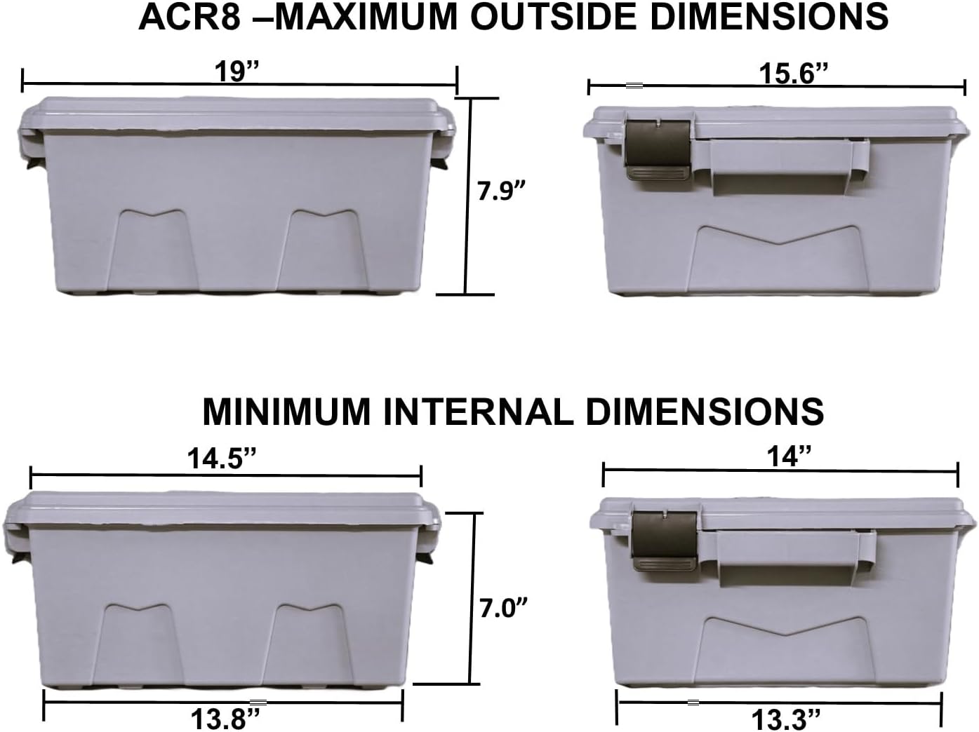 Designed for ammo storage, but perfect for storing shooting, hunting or survival gear. Two extra strong handles make it easy to carry upto 85 pounds of gear. Designed to be stacked high, using molded-in stacking ridges. Four tie down points for ATV attachment. Features MTM's tongue and groove O-Ring seal system for a water-resistant dry storage. Double padlock tabs along with two strong latches make these ammo crates the perfect solution for many storage needs. Made in the USA, with high-impact polypropylene plastic.