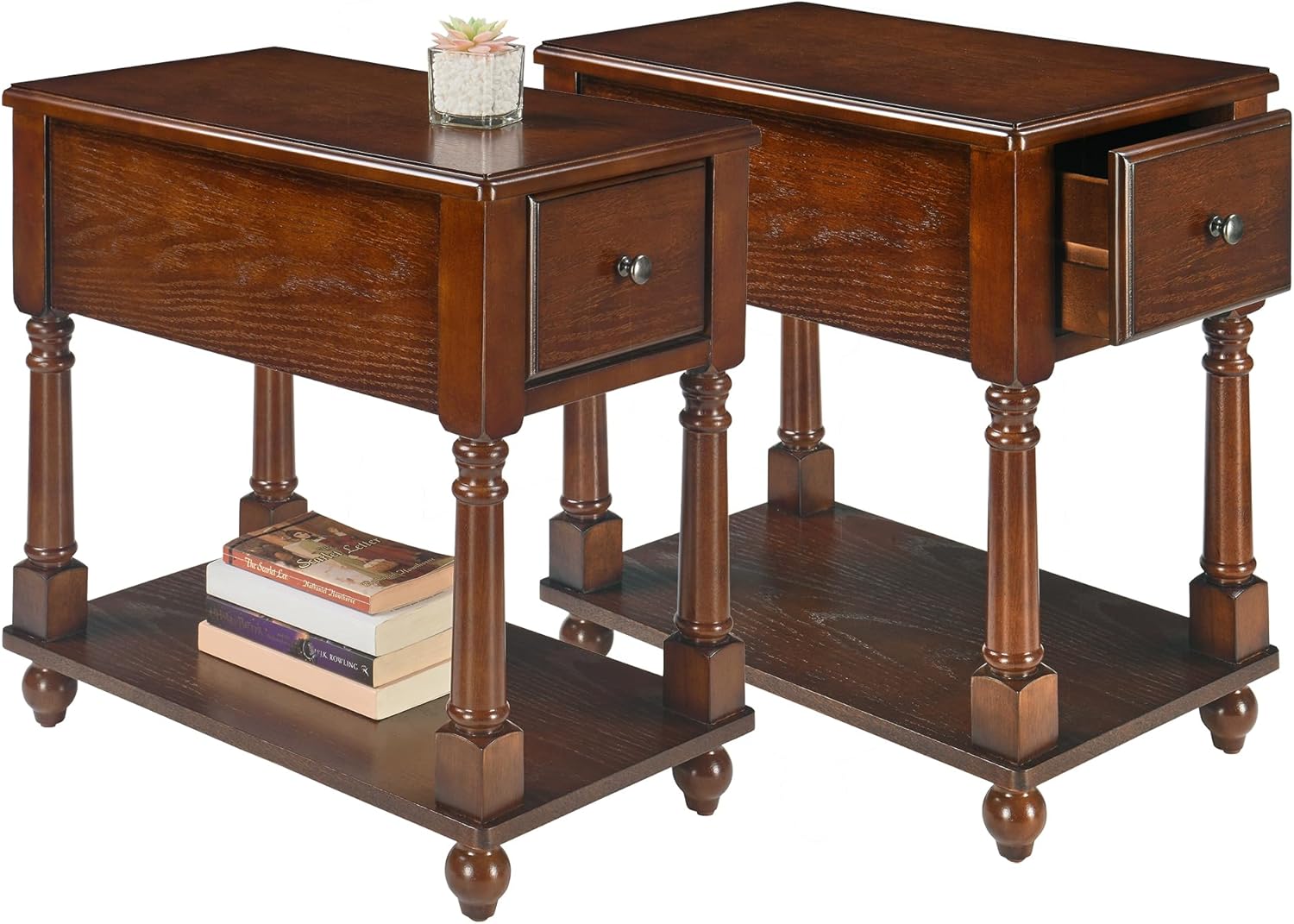 Multi-functional Home Narrow Table Put it beside sofa as side table for living room. Fashionable and simple surface and solid wood frame, elegant appearance add simple beauty to your living room . Classic style is suitable for any family furniture decoration.Specification: Product Name: Narrow End Table With Drawer Product Color:Dark Walnut Material:CHERRY VENEER+POPLAR WOOD+MDF+PB Overall Size: 13 * 22 * 22.7 Inches Product Weight:22.42Lbs Package Include: End Table*1 Screw accessories package*1 Installation drawings*1