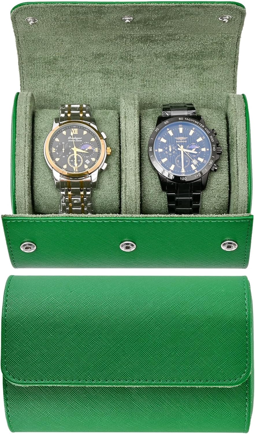 Product Features: ROSELLE Watch Roll Travel storage case for 3 watchesGives outstanding protection and security at home from dust, particulates, falls and spillsMade of PU leatherSoft suede material insideProtect your dial from frictionWatch pillows secured with studsWon't jiggle or fall outInstantly remove or replace watchesCompact size 8.85"(L)*2.75"(W)*3.95"(H)Easily fits in luggageWeighs just 1 poundSuperior design and materials to compliment your luxury watches