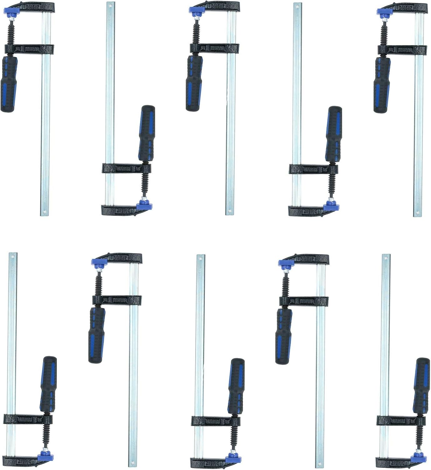 Professional F Clamps for commercial or occasional use Heavy Duty F Clamp This listing is for 10 x F clamps 300mm x 50mm Sliding F Bar Clamp Mini F Clamp for intricate detailed work with little space Suitable for all holding purposes on wood, steel and other materials Suitable for all general clamping applications Protected jaws to prevent damage to work pieces Heavy duty clamps with cast jaws and high impact for maximum holding capacity Manufactured from chrome vanadium steel for strength and durability Soft grip handles for comfort and grip Removable soft plastic jaw guards for when a stronger hold is required Quick sliding action to change the size of the clamp efficiently and quicklySPECIFICATIONS SIZE - 300mm x 50mm MAX OPENING - 300mm CLAMP CLEARANCE - 50mm PACK SIZE - 10 pc