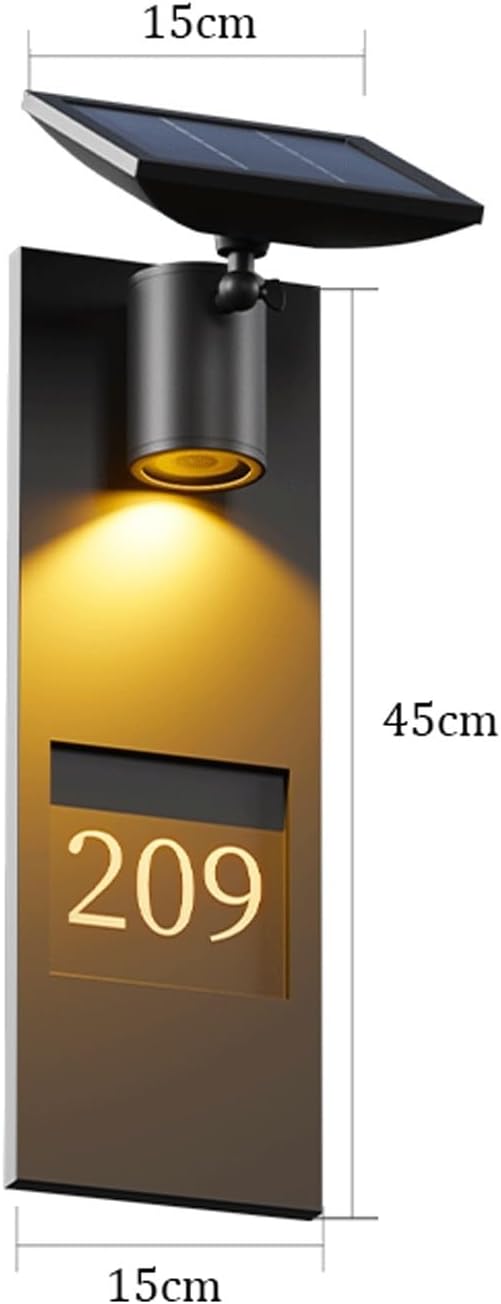 Our lighting fixtures are created with structural reliability in mind, offering dependable performance for exterior wall applications across various building types.Type: Outdoor Solar Wall Light / Address Sign Lamp / House Number LightStyle: Modern, Minimalist, FunctionalMaterial: Stainless Steel (Lamp Body), High Conversion Polysilicon (Solar Panel)Color: BlackDimensions:Total Height: 17.72" (45cm)Width / Side Length: 5.91" (15cm)Solar Panel Width: 5.91" (15cm)Light Source: LED (Super Bright)Battery: Lithium Iron Phosphate BatteryCharging Time: 6–8 hours under sufficient sunlightProtection Rating: IP65 Waterproof, Rust-proof and High-temperature resistantProcess: Spinning, Frosted, Spray PaintingSpecial Feature: Dual-function design combining an adjustable spotlight with a house number plate; Solar-powered with intelligent dusk-to-dawn automatic sensing; Durable stainless steel construction for long-term outdoor exposure.Applicable Space: Villa Front Door, Garden Entryway, Courtyard Gate, Mailbox Area, Exterior Wall, Street Side Identification.Developed with a stable wall-mounted structure to ensure consistent performance in outdoor environments.