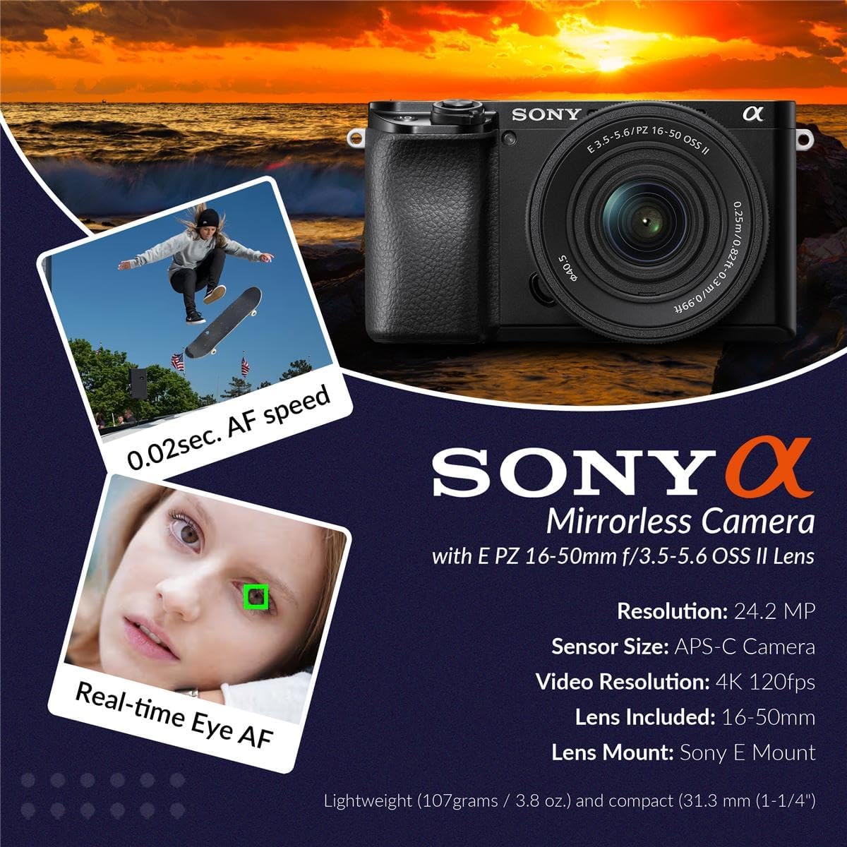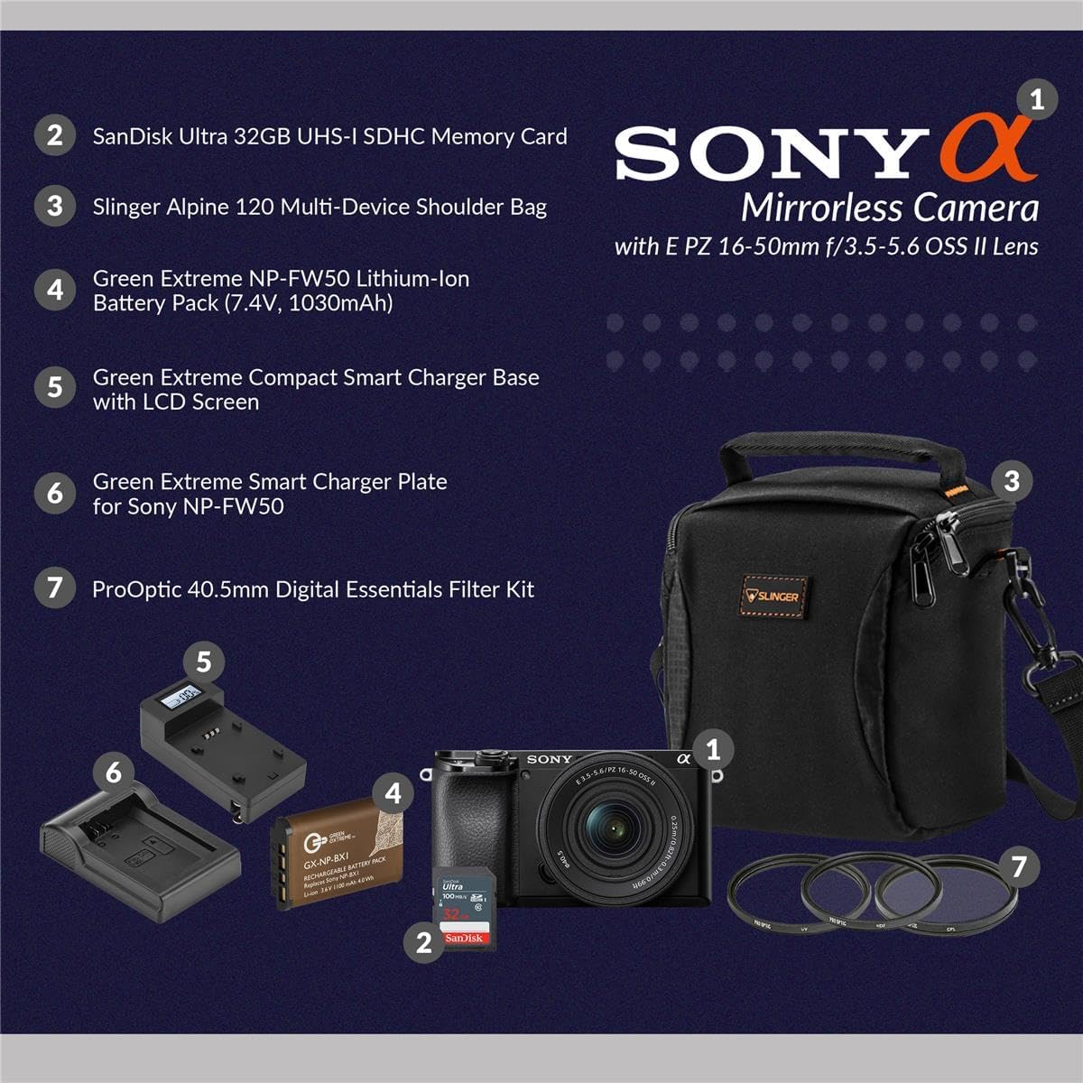 The <b>Sony Alpha A6100 Mirrorless Camera with the E PZ 16-50mm f/3.5-5.6 OSS II lens</b> in black comes as part of a complete bundle that includes an adapter, body cap, cable, strap, two lens caps, a memory card, shoulder bag, battery, charger with charger plate, and a filter kit—offering everything needed for both beginners and advanced users. This camera is powered by a 24.2MP APS-C Exmor CMOS sensor, delivering impressive image quality with excellent detail and performance in low light. The BIONZ X image processing engine ensures fast processing and top-notch photo and video results. A 425-point hybrid autofocus system provides wide coverage and accurate focusing, including real-time eye autofocus for both humans and animals, while real-time tracking keeps moving subjects in sharp focus. The camera supports continuous shooting at up to 11 frames per second, making it ideal for capturing fast action. Additionally, it records stunning UHD 4K video with full pixel readout. It boasts broad compatibility with a variety of SDHC devices and includes a padded shoulder bag with customizable dividers to safely store and organize your gear. The included battery has a 1030mAh capacity, providing reliable power for extended shooting sessions.