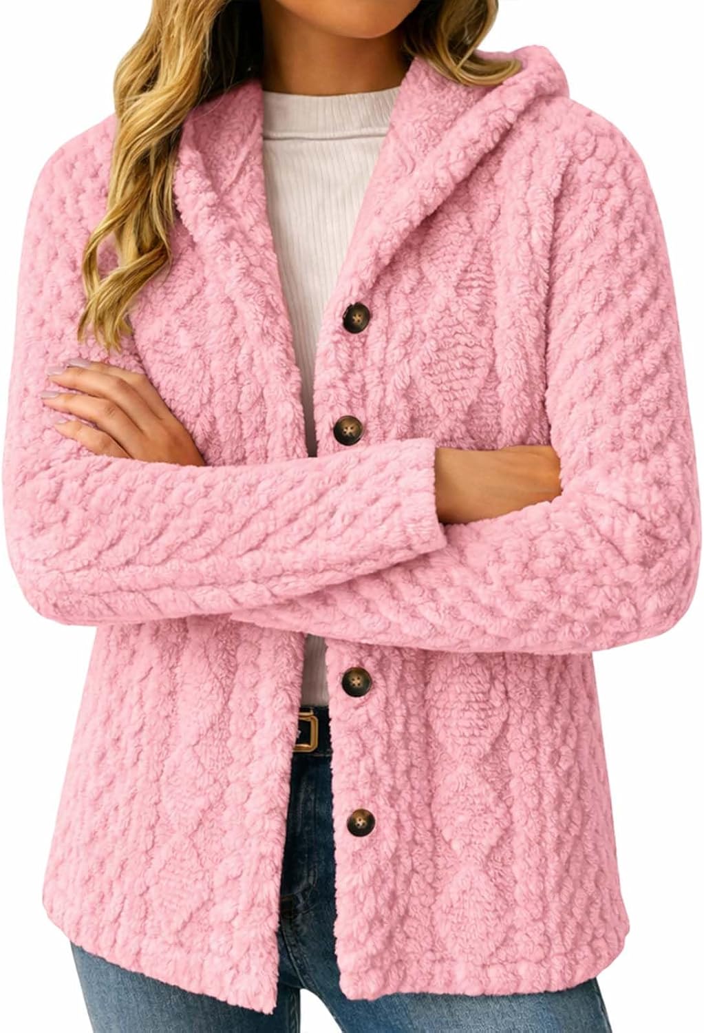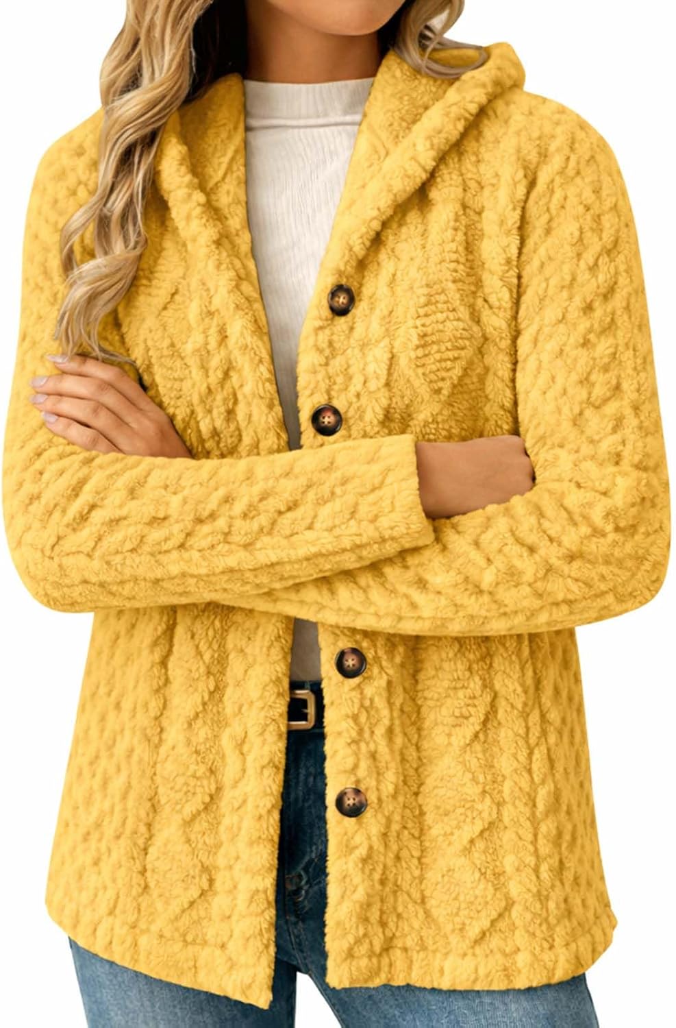 This womens hooded cardigan is designed to balance warmth, comfort, and everyday style. Crafted from plush with a jacquard knit texture, it offers a soft hand feel while remaining breathable for extended wear. Soft fabric with jacquard knit texture Hooded cardigan design with button-up front Oversized fit for comfortable layering Lightweight construction with cozy warmth Suitable for casual wear, commuting, and indoor lounging Product Name: Women’s Hooded Cardigan Sweater Jacket Material: Polyester Sleeve Length: Long Sleeve Closure Type: Button-Up Front Style: Hooded Cardigan, Sweater Jacket Season: Fall / Winter / Early Spring Care Instructions: Machine Wash Cold, Tumble Dry Low Colors: Multiple Colors Available Sizes: S–5XL Product Includes: 1 × Women’s Hooded Cardigan Sweater Jacket