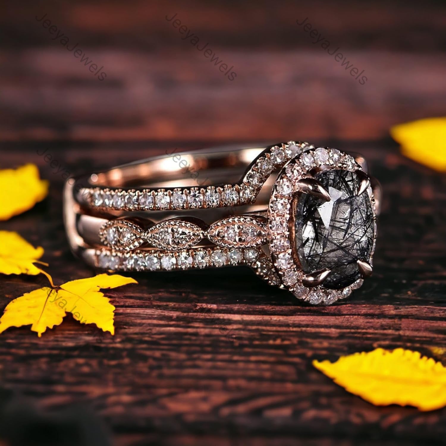 Vintage Black Rutilated Quartz Wedding Ring Set Solid Rose Gold Diamond Halo Engagement Gift Enhancer Valentine Proposal Ring Solitaire Bridal Statement Ring Discription :- Main Stone - Black Rutilated Quartz Stone Color - Black Stone Shape - Oval Stone Size - 8x6