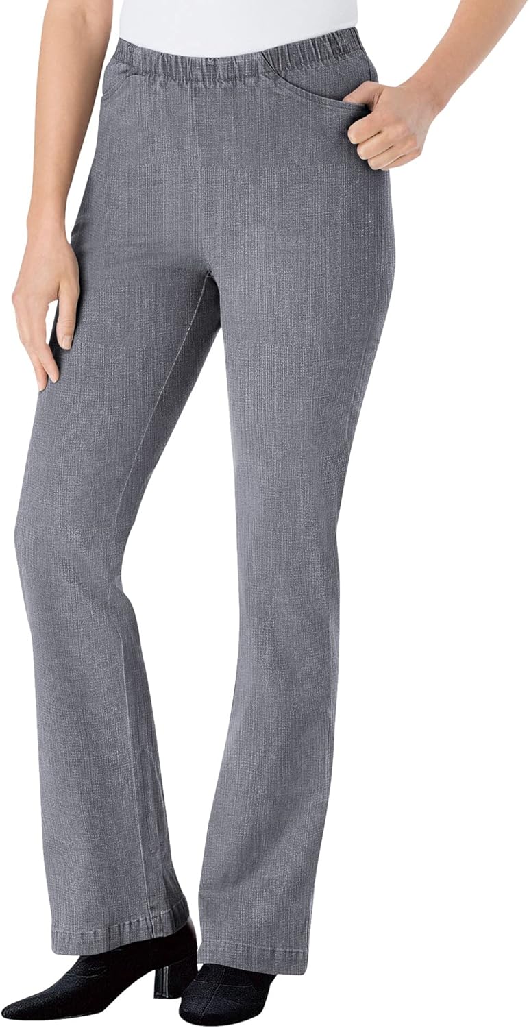 Designed with stretch to give you the perfect fit, an all-around elastic waistband makes them even more comfortable. This pull-on style features slant pockets on the front and a pocketless back for a smooth effect. This bootcut jean has a slight flare that fits over your boots or goes great with any other shoe. Sits at the waist. Cotton/poly/spandex, imported. Chocolate and Black colors made in twill. Machine washable.